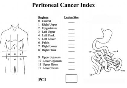 6.Peritoneal Cancer Index: (PCI) There are some scoring systems for evaluating the degree or extent of peritoneal carcinomatosis. These are; Gilly staging, Japanese gastric cancer P score, Peritoneal cancer index (PCI) and Simplified peritoneal cancer index (SPCI). The most widely used of these is the "peritoneal cancer index", which is a scoring system that determines and standardizes the prevalence of peritoneal carcinomatosis. In this scoring system, the abdomen is divided into 9 regions. The umbilical region is taken as 0, starting from the right upper quadrant, each region is numbered clockwise. 9-12 are the numbers given to the small intestine sections. Lesion size (LS) is used to identify peritoneal nodules.